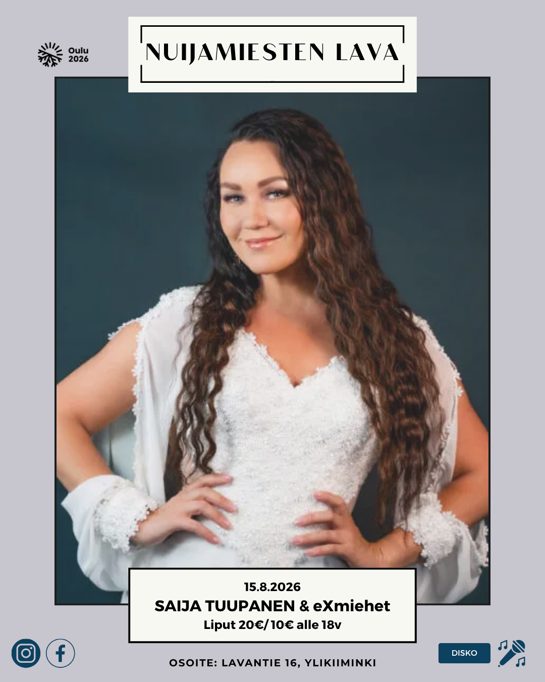 Lauantaina 15.8. Nuijamiesten lavalla esiintyvät Saija Tuupanen & eXmiehet. Luvassa on taatusti tanssittava ilta, jossa lavalle nousee yleisön suosikki ja Nuijamiesten kesä jatkuu vahvalla ohjelmalla.