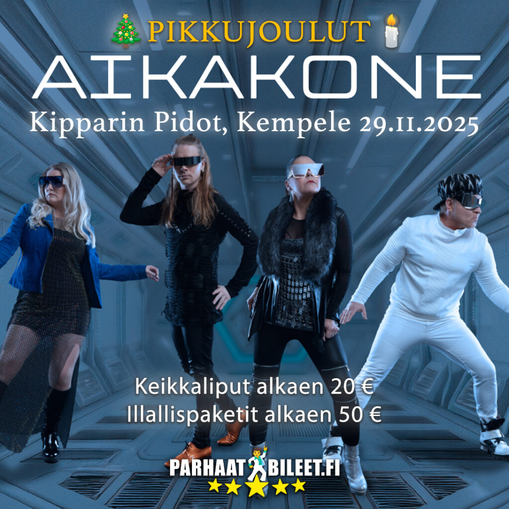 Marraskuun lopussa on luvassa huikeat pikkujoulut Kempeleeseen, kun Kipparin Pidot tarjoaa mahtavan menon! Lavalle nousee loistava Aikakone ja tämähän tarkoittaa: BILEEEEEEET! 🥳 Kovassa keikkakunnossa ja ahkerasti kiertävä Aikakone ei jätä ketään kylmäksi – ei vaikka marraskuu tarjoaisi kuinka viileää ja synkkää meininkiä. Entisessä työväentalossa ilo on ylimillään ja korkkarit kohti kattoa kun neiti Groovet pistää parastaan! 💃